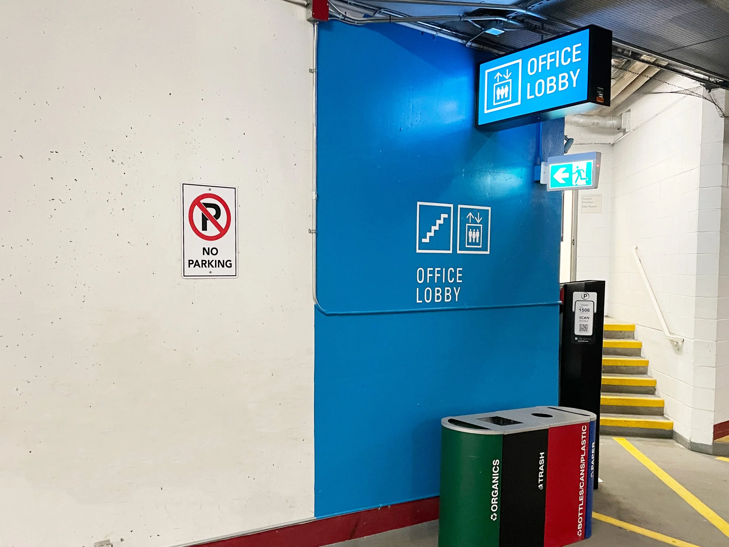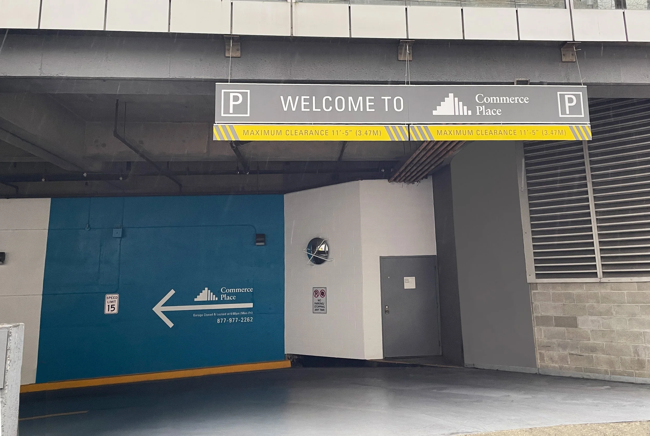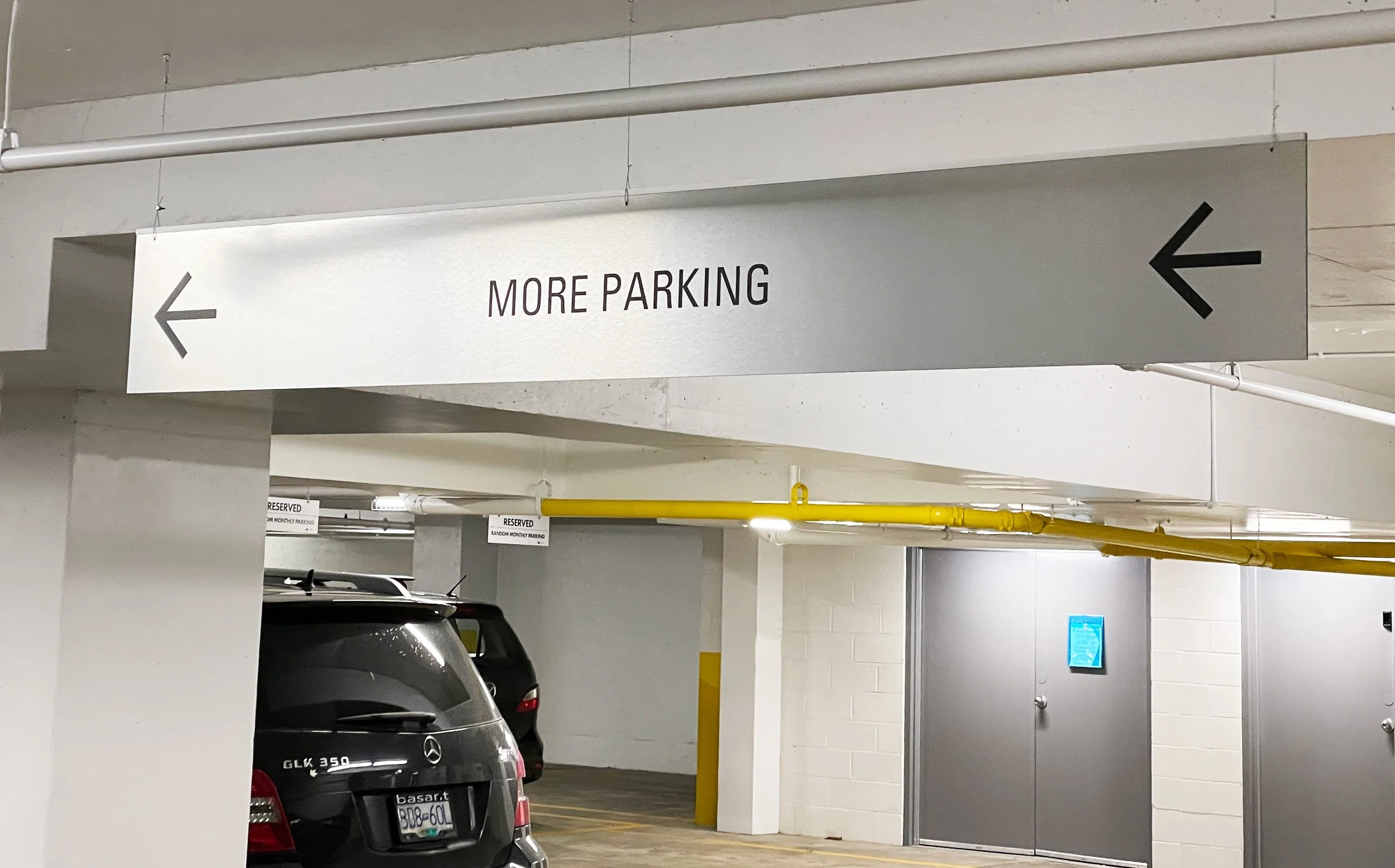 As the existing parkade contains several generations of worn and outdated signage, and is also missing key signage in helpful areas, we understand EDG is to prepare a contemporary and cohesive parkade and exterior wayfinding and signage design recommendation. The project will also need to consider existing exterior signage leading to and identifying the parkade entrance, as these are outdated, and could be made more discrete given the limited parking stalls available. Recently fabricated elevator lobby and room identification signage shall be retained, and any new proposed signage should visually complement with the objective of creating a cohesive sign program family.